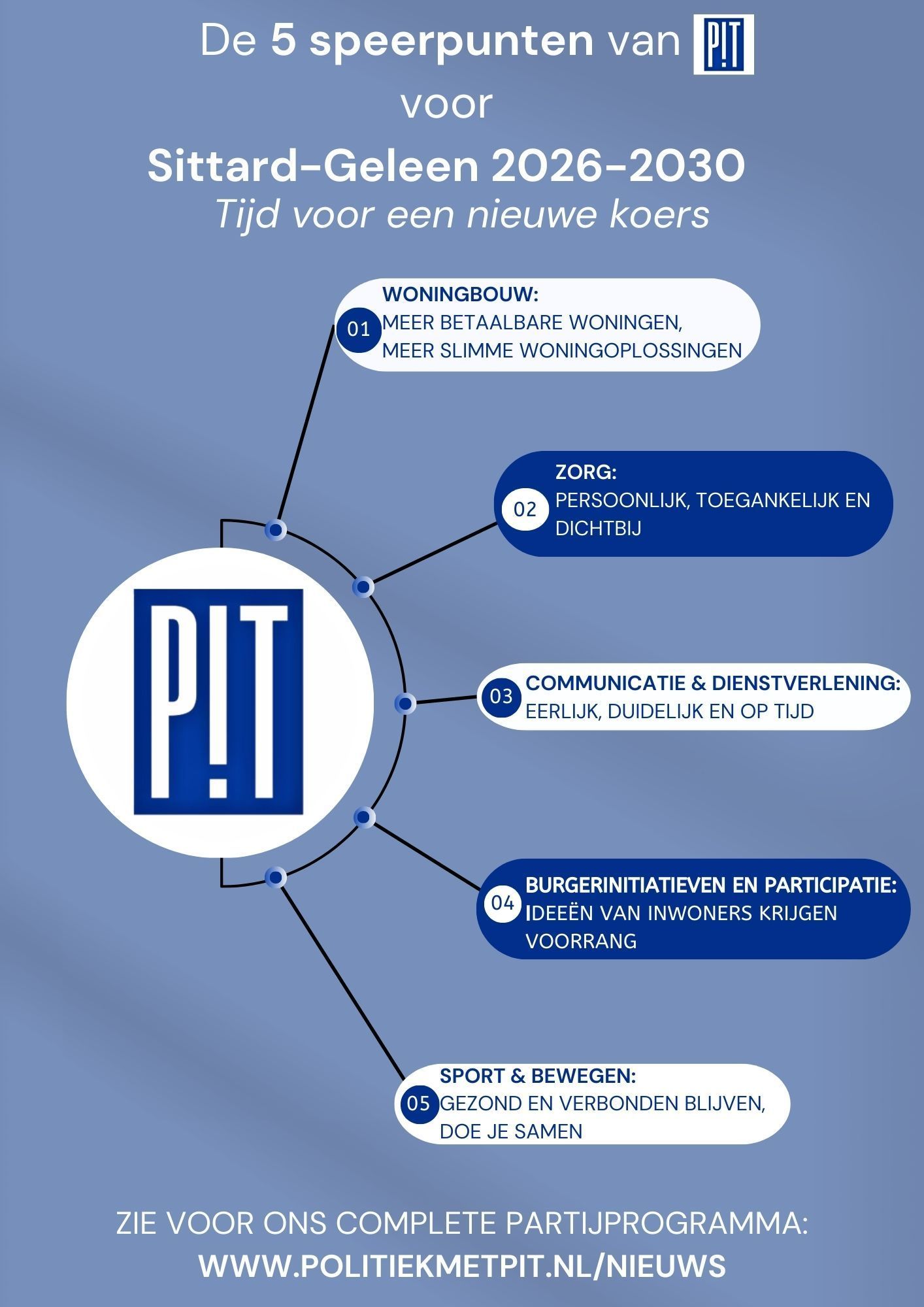 P!T richt zich niet uitsluitend op links of op rechts, maar opereert vanuit het midden. Daarbij ligt ons accent telkens weer op daar waar het omdraait: het belang van Sittard-Geleen. De teamleden van P!T hebben elk op hun eigen manier een band met de gemeente. Vandaar dat we dan ook kunnen stellen dat P!T een partij is van inwoners van Sittard-Geleen, voor de inwoners van Sittard-Geleen. Ongeacht leeftijd, huidskleur, geslacht, etnische afkomst of religie. Wie het beste voor heeft met onze gemeente en wie zich wil inzetten, vindt bij P!T altijd een luisterend oor en is altijd welkom!